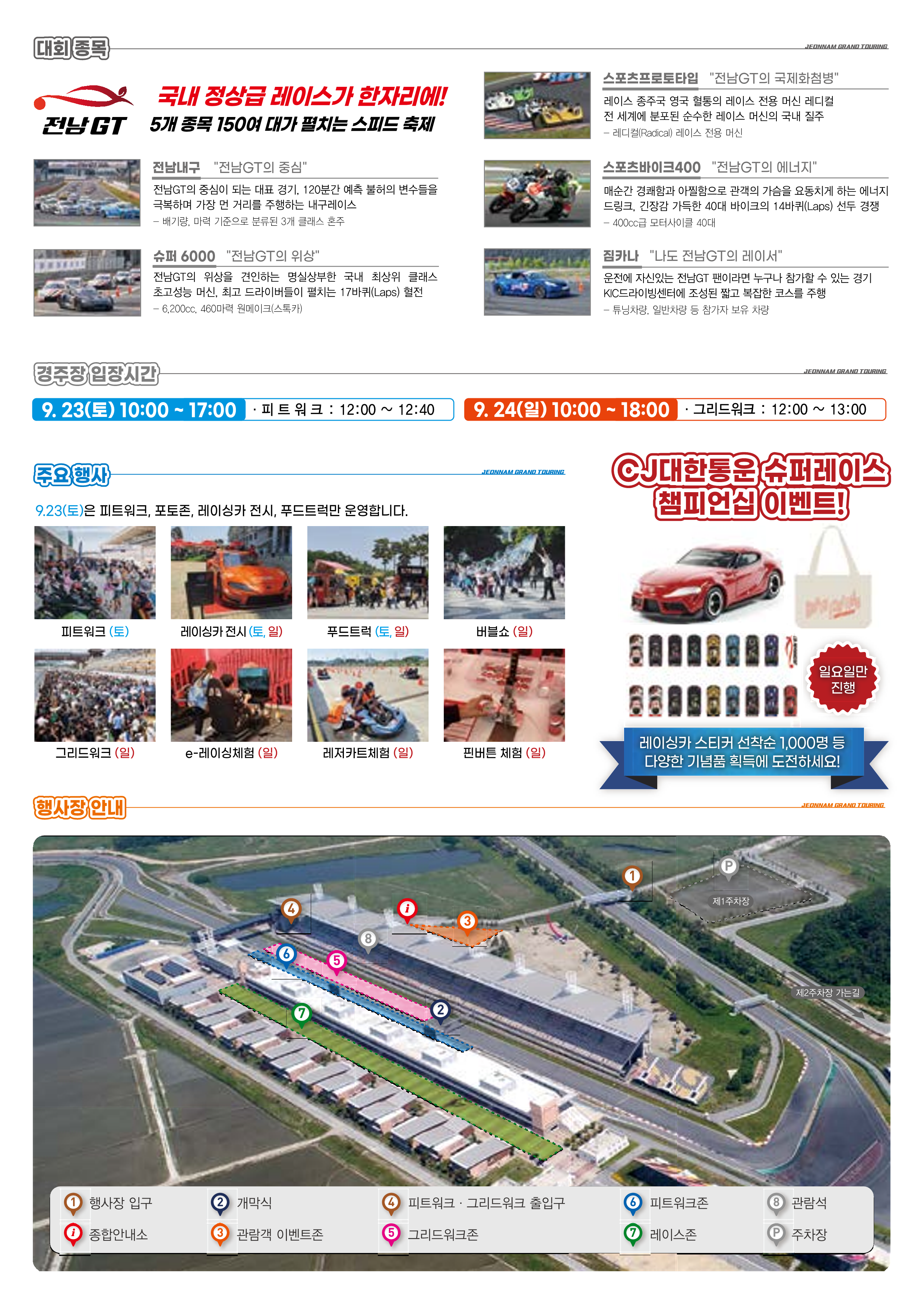 ○ 대 회 명 :2023 전남GT 대회 ○ 기 간 :’23.9. 23.(토) ~ 9. 24.(일) *개막식 : 9. 24.(일) 12:40 ○ 장 소 :국제자동차경주장(전남 영암군) ○ 주최/주관 : 전라남도 / ㈜슈퍼레이스·펠롭스 ○ 규 모 : 5개 종목 150여대, 선수·관계자 2천여명, 관람객 1만여명 ○ 주요내용 : 모터스포츠 대회, 서킷 문화행사 등 - (경주대회) 전남내구, 슈퍼6000, 스포츠바이크400, 레디컬, 짐카나 등 - (부대행사) 개막식, 그리드워크, 카트체험, 서킷택시, 가상레이싱, 지역특산품 홍보 등 |
