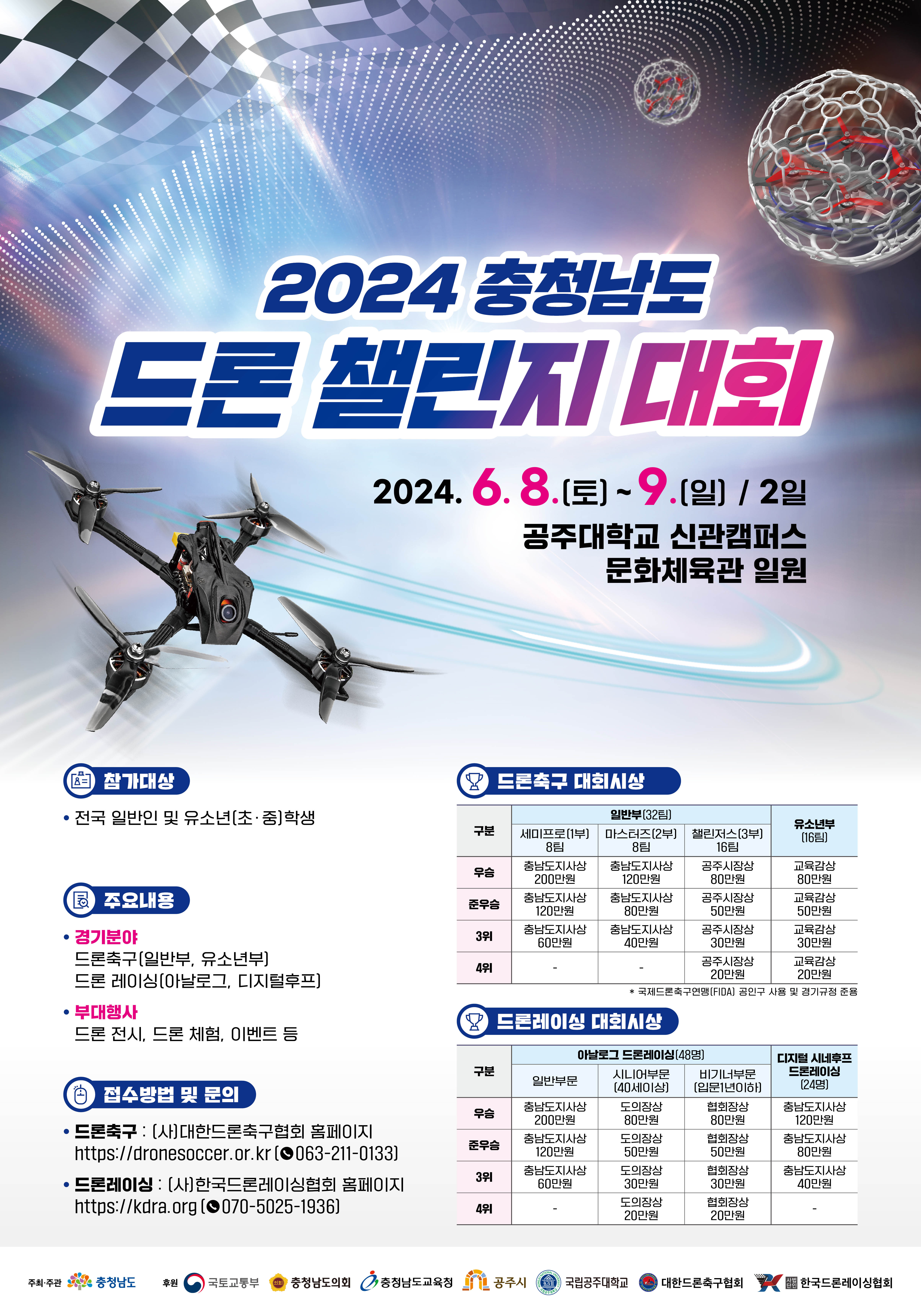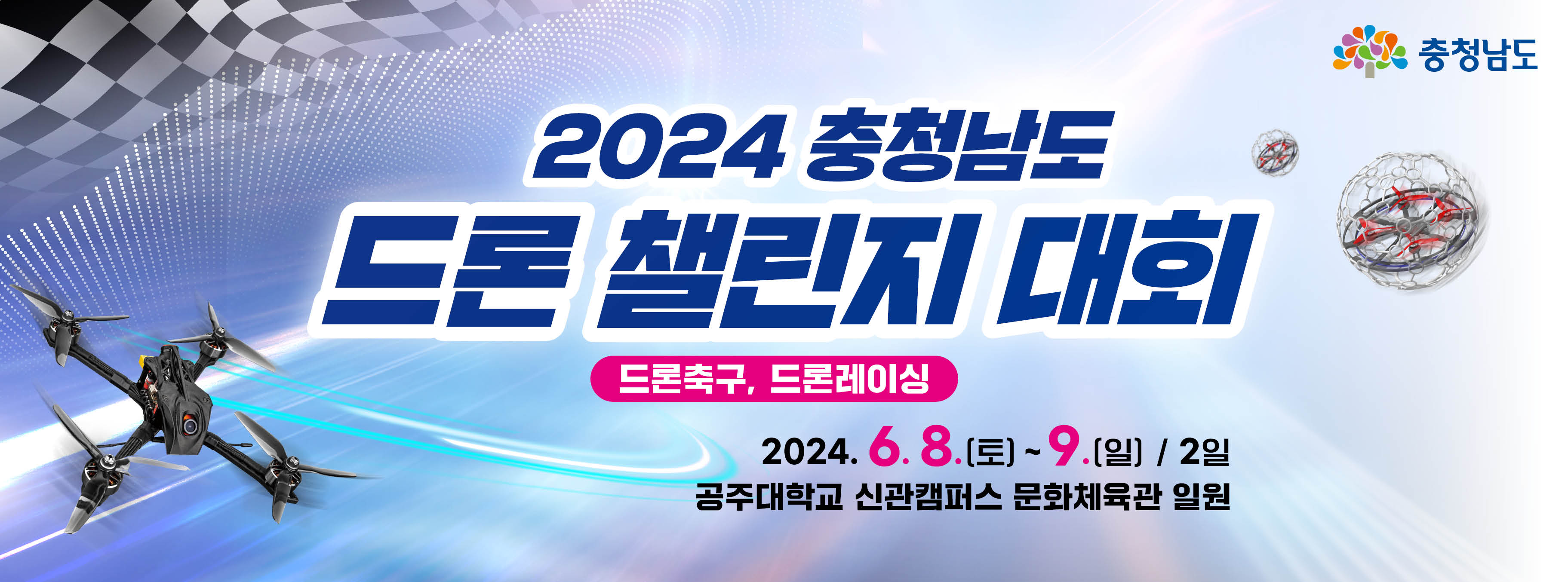 우리 도에서는 드론레저스포츠 산업 전국 선도 및 활성화를 위하여 '2024 충남 드론 챌린지(Challenge) 대회' 를 아래와 같이 개최할 계획입니다.