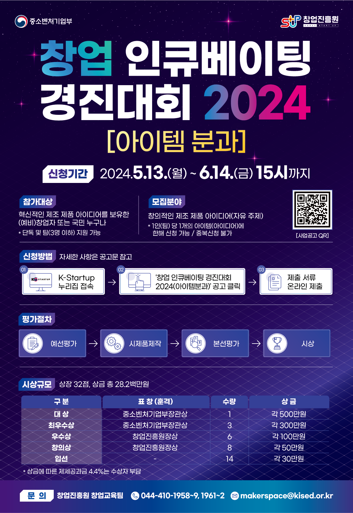 유망 제조창업자 발굴 및 메이커 활성화를 위한「창업 인큐베이팅 경진대회 2024(아이템 분과」참가자 모집