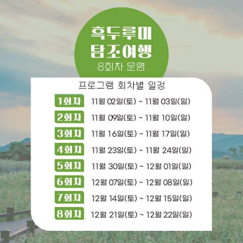16:00∼19:00 | 순천역 집결 → 순천만습지 → 철새 탐조 → 순천만습지 자유투어 | 성인 | 13,000원 |