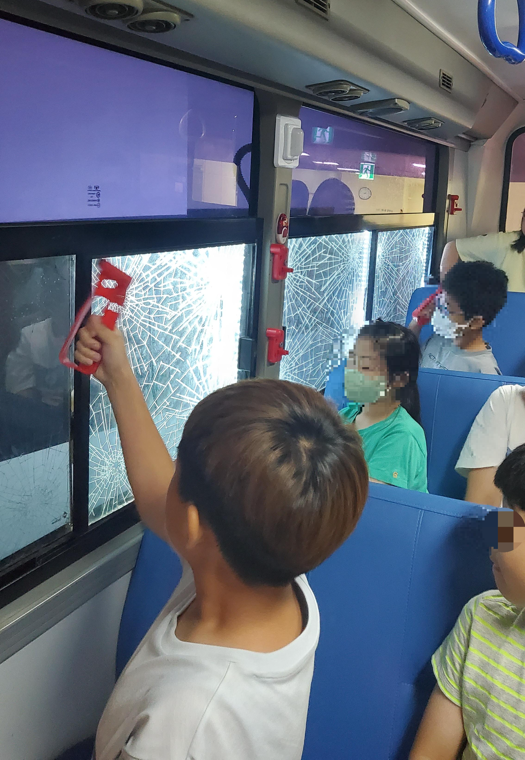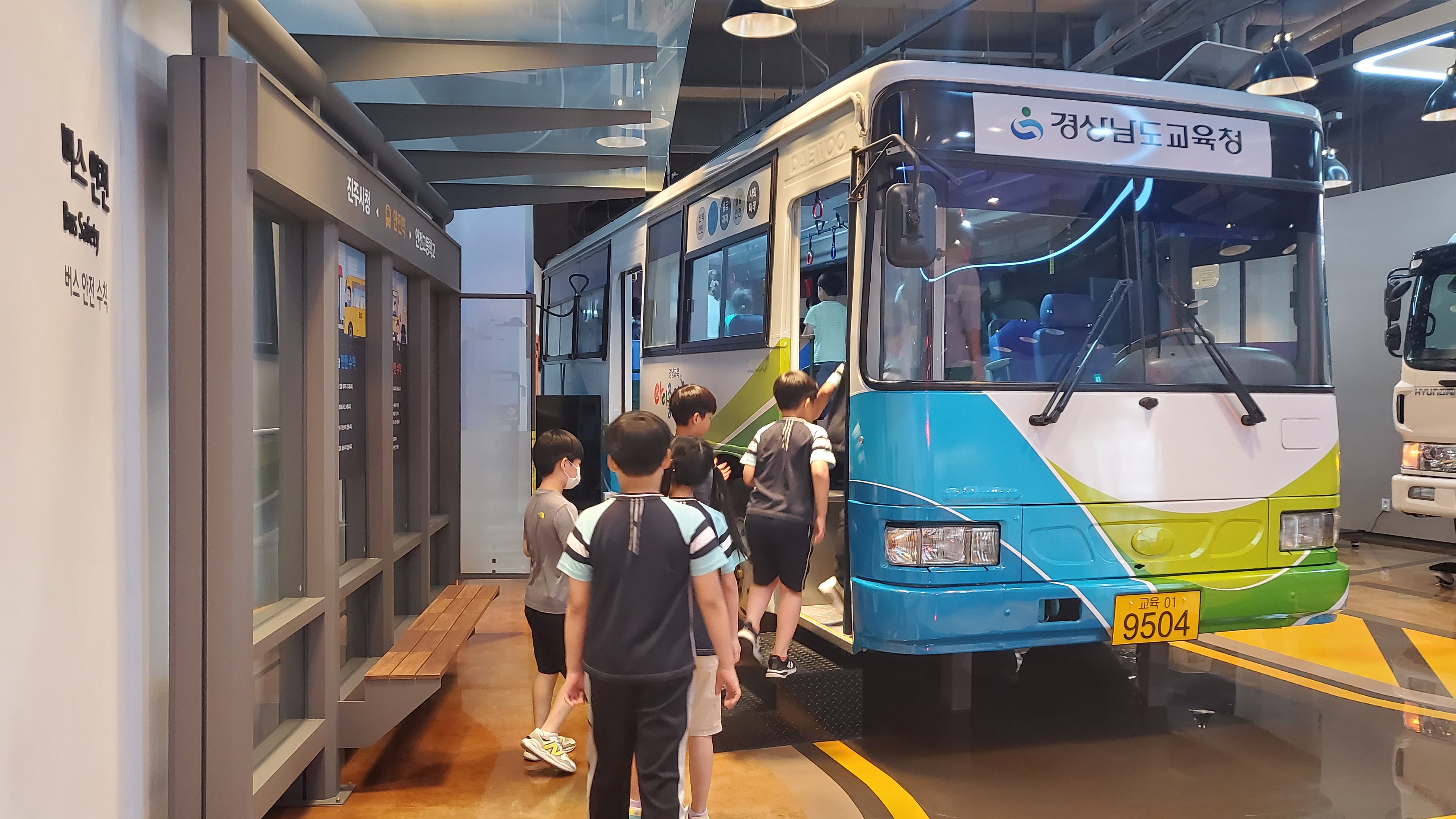 버스 안전은 실제 버스가 교육관 안에 떡하니 놓여있습니다. 버스에 탑승 후 교육이 이루어집니다. 버스 사고 시 창문을 통해 탈출 하는 요령을 체험합니다. 비상망치를 사용하여 창문을 깨는 법을 배우는데 실제 망치는 아니고 플라스틱 망치를 가지고 창문을 두드리면 깨지는 효과를 보여줍니다.