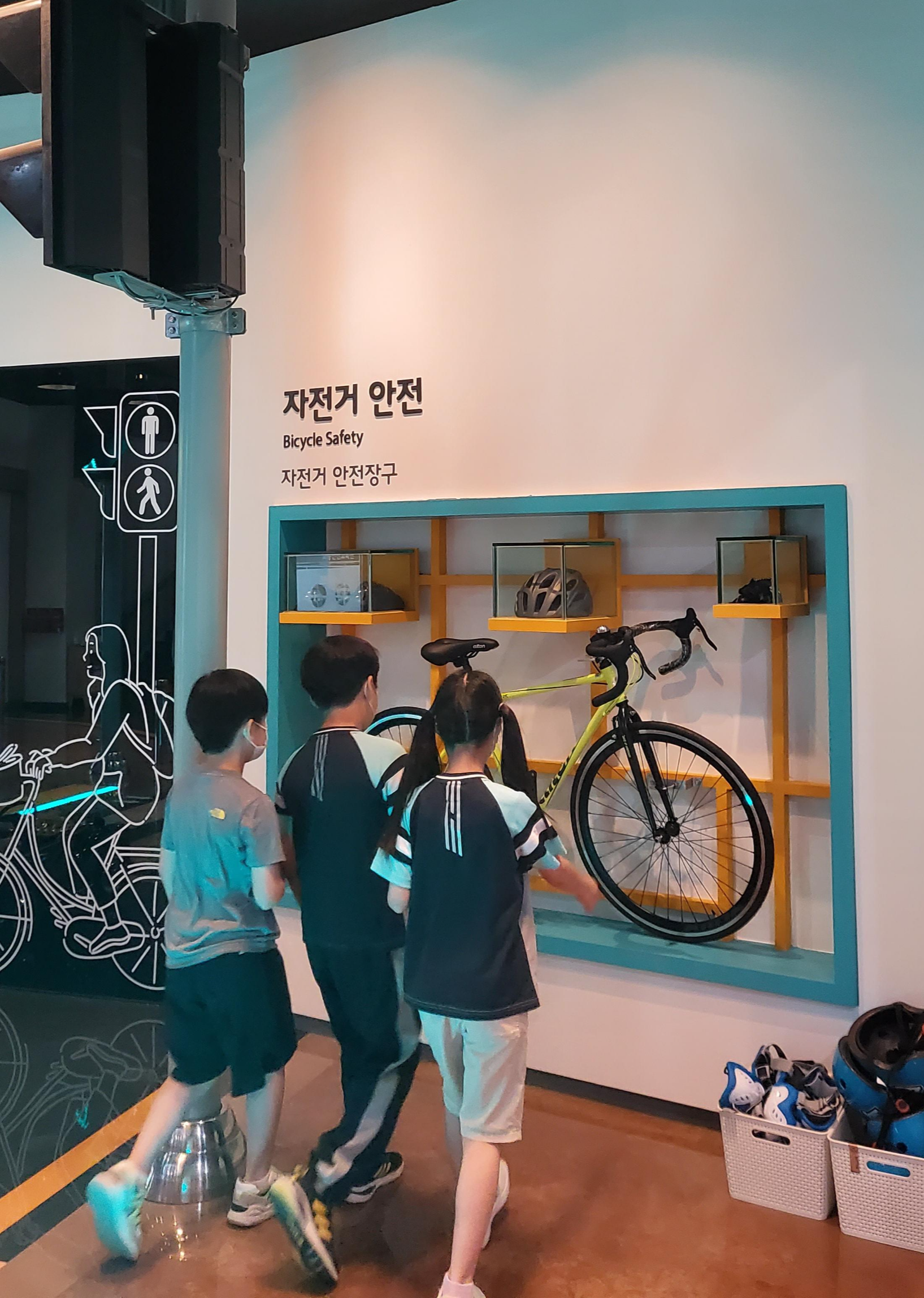 옆으로 이동하면 자전거 안전 교육입니다. 직접 타는 건 아니고 자전거 구조에서 몇몇 장치들이 빠져 있거나 작동이 안되게 되어 있어서 체인을 돌려보거나 조작을 통해 자전거의 안전성에 대해 배웁니다.