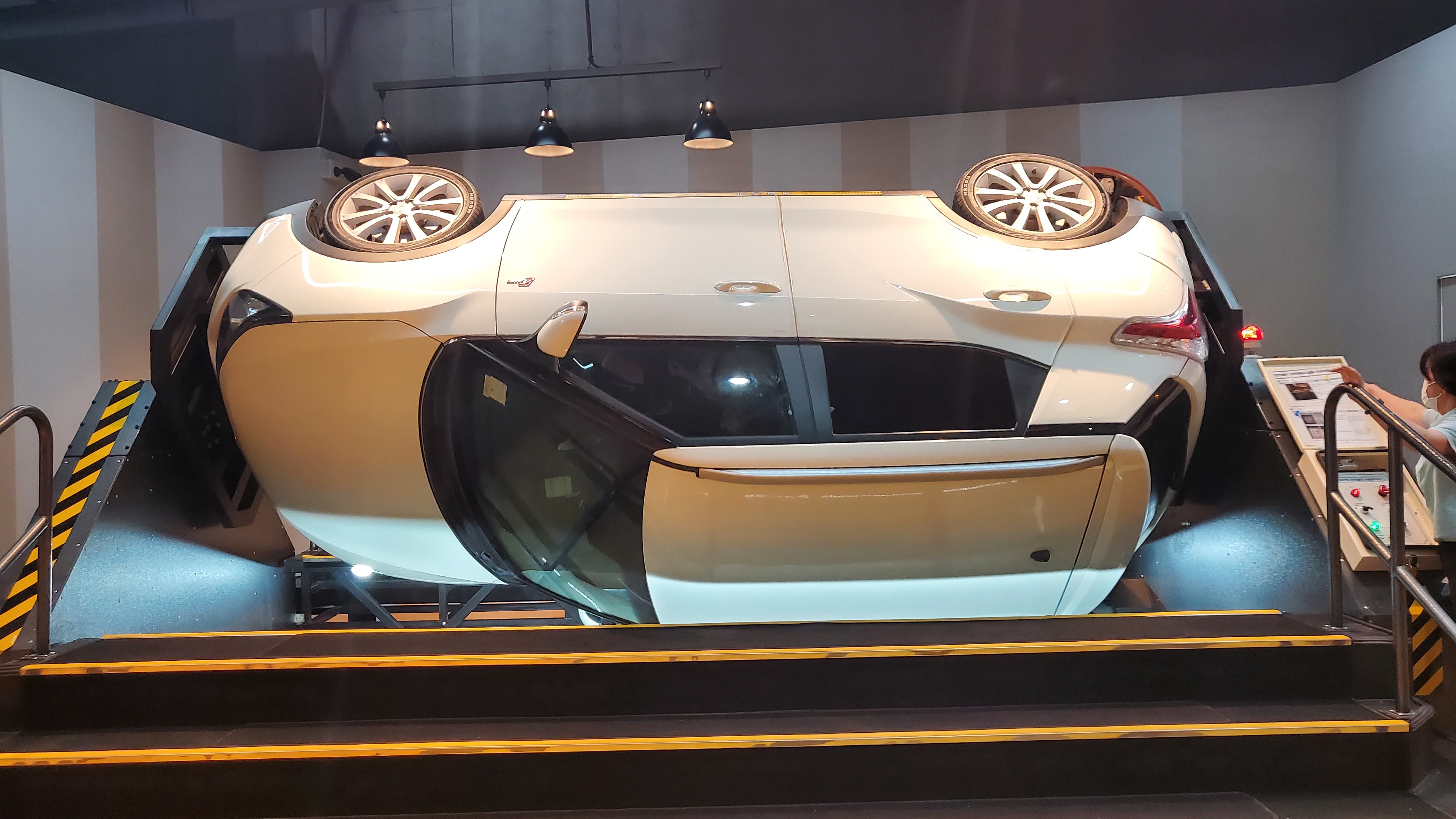 이번 안전교육의 하이라이트라고 생각되는 차량전복사고 시 안전벨트 착용의 중요성 체험입니다. 안전벨트를 맨채로 차량을 360도 돌려줍니다. 하....짜릿한 경험과 머리가 쭈뼛해지는 공포를 느낄 수 있습니다. 안전벨트가 몸을 지탱해주지만 가슴과 배가 압박되며 약간의 고통이 느껴지더군요. 약 10여초 간의 롤링이지만 평소에 접해볼 수 없는 귀중한 경험이었습니다.